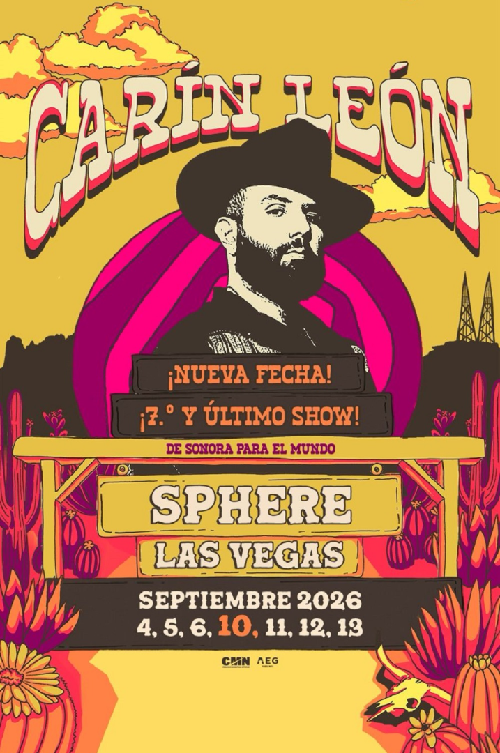 Carín León, originario de Hermosillo, Sonora, anunció la séptima y última fecha de su histórica temporada en la Sphere de Las Vegas, con una nueva presentación programada para el 10 de septiembre de 2026.